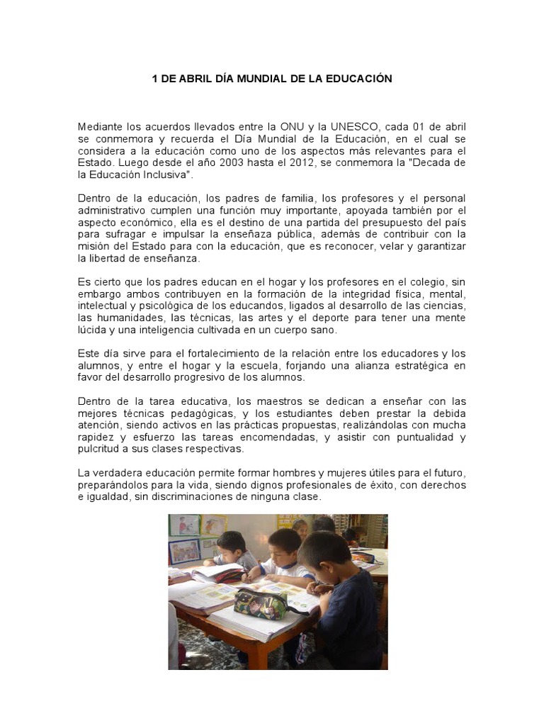 1 De Abril Dia Mundial De La Educacion - - La misión del estado consiste en reconocer y garantizar la libertad y la enseñanza.. Lunes, 1 de abril de 2019. La educación el proceso de aprendizaje en todo el aspecto del conocimiento, donde se brindan facilidades y herramientas para la mejoría de la es importante mencionar que la educación no solo se produce por medio de la palabra, sino, vemos que la buena formación se muestra en acciones. Por acuerdos entre la onu y la unesco, cada 1 de abril se recuerda el día mundial de la educación, uno de los pilares fundamentales de todos los estados, donde se asienta el futuro de los pueblos. La asamblea general de las naciones unidas proclamó el 24 de enero día internacional de la educación. Día mundial del síndrome de down.